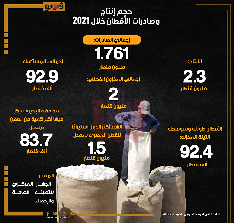 حجم إنتاج وصادرات الأقطان خلال 2021 | إنفوجراف الأحد 04/سبتمبر/2022 - 12:45 م 9/4/2022 12:45:36 PM الأقطان المصرية حاتم أحمد شارك طباعة 18 حجم الخط شارك طباعة القطن الهند الإحصاء صادرات الاقطان الجهاز المركزى للتعبئة العامة والإحصاء