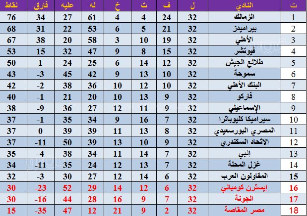 تنشر فيتو جدول ترتيب الدوري الممتاز لكرة القدم بعد انتهاء الجولة الـ 32 للمسابقة بمباراة الأهلي مع إنبي.