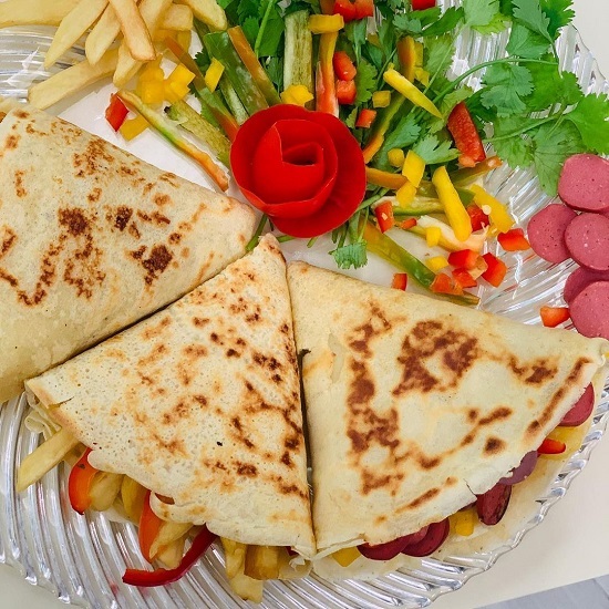 - نضيف الموتزاريلا، ونغلق العجين مثلث، ونضعه على مقلاة غير لاصقة ونرفعه على النار، ونتركه حتى يتحمر قليلا، ثم نقلبه على الوجه الآخر حتى يتحمر أيضا، ويقدم بعدها ساخنا بجانب البطاطس المقلية والمخلل.