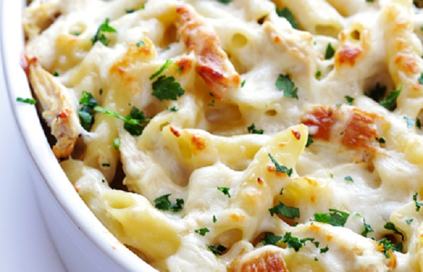 - ثم نصب خليط المكرونة والدجاج والبشاميل، فى صينية الفرن.