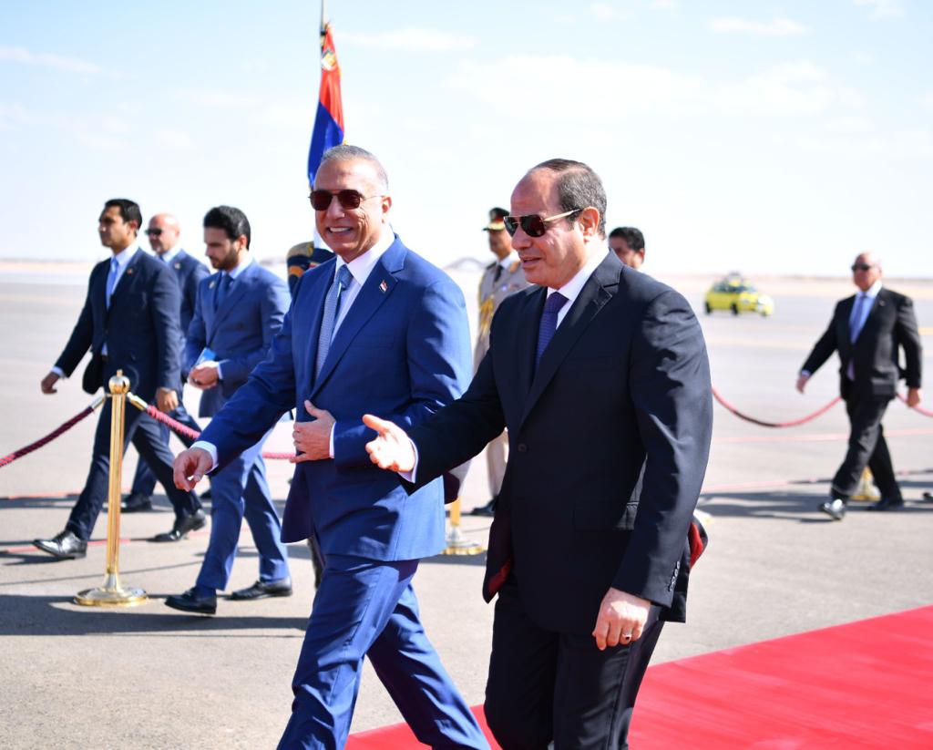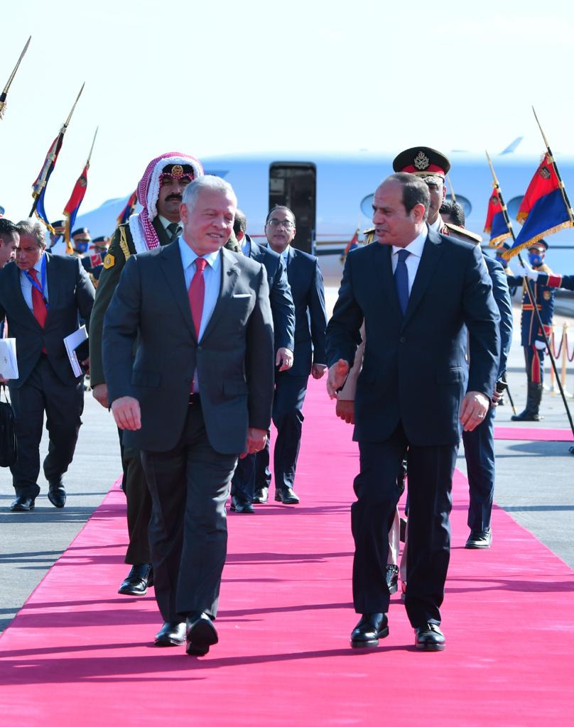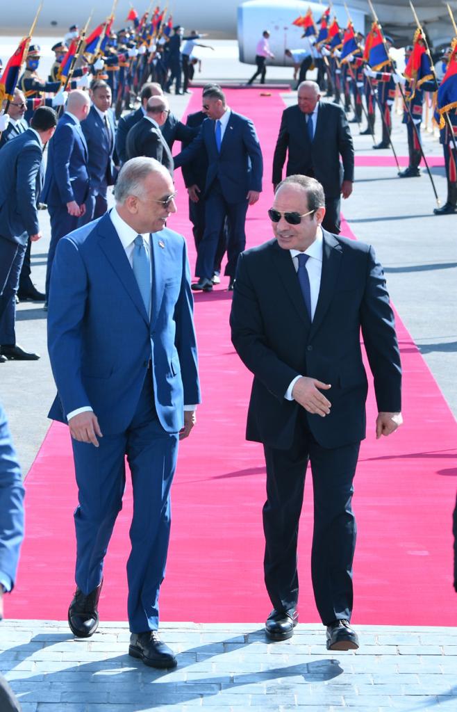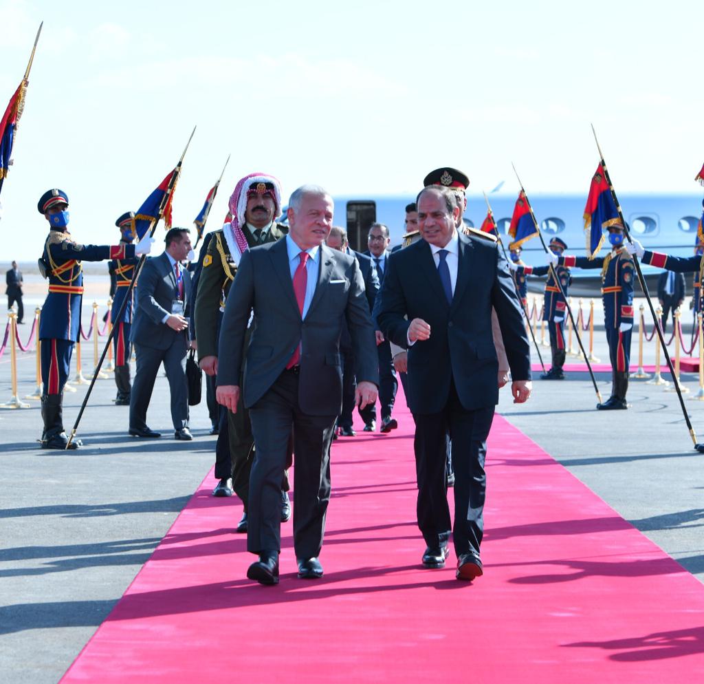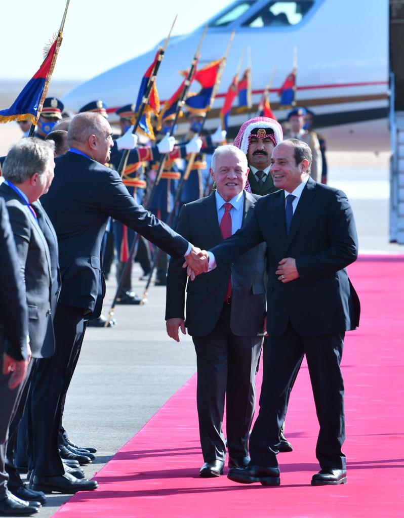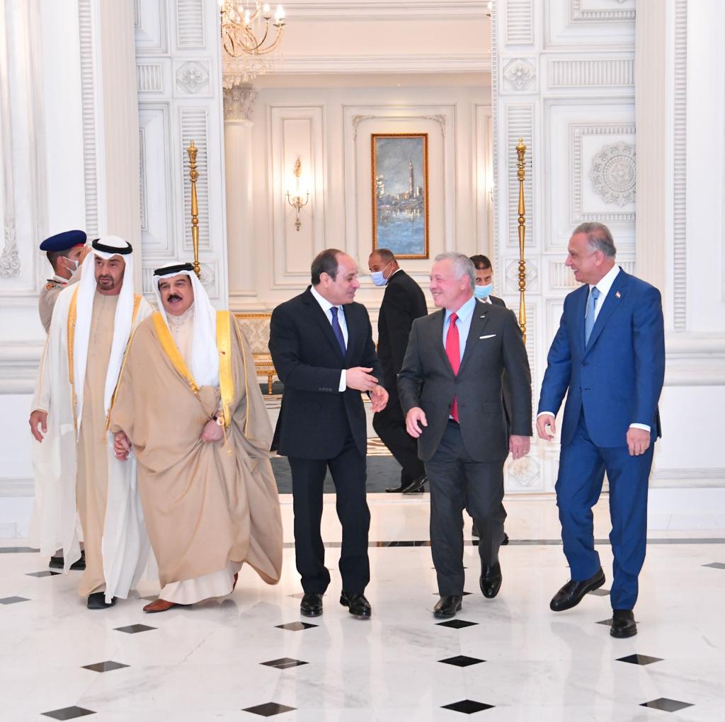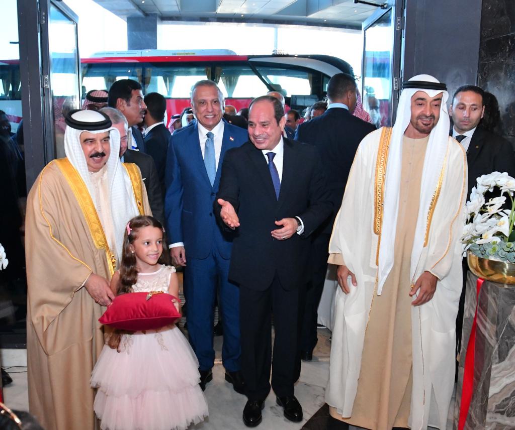 كما استقبل الرئيس عبد الفتاح السيسي بمطار العلمين وبحضور الشيخ محمد بن زايد آل نهيان رئيس الامارات، كلًا من الملك عبد الله الثاني بن الحسين، ملك الأردن، والملك حمد بن عيسى آل خليفة، ملك البحرين، وفخامة السيد مصطفى الكاظمي، رئيس الوزراء العراقي".