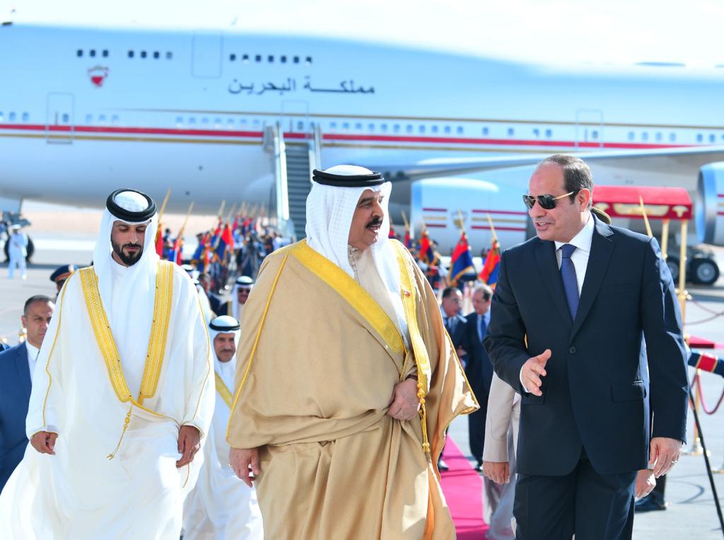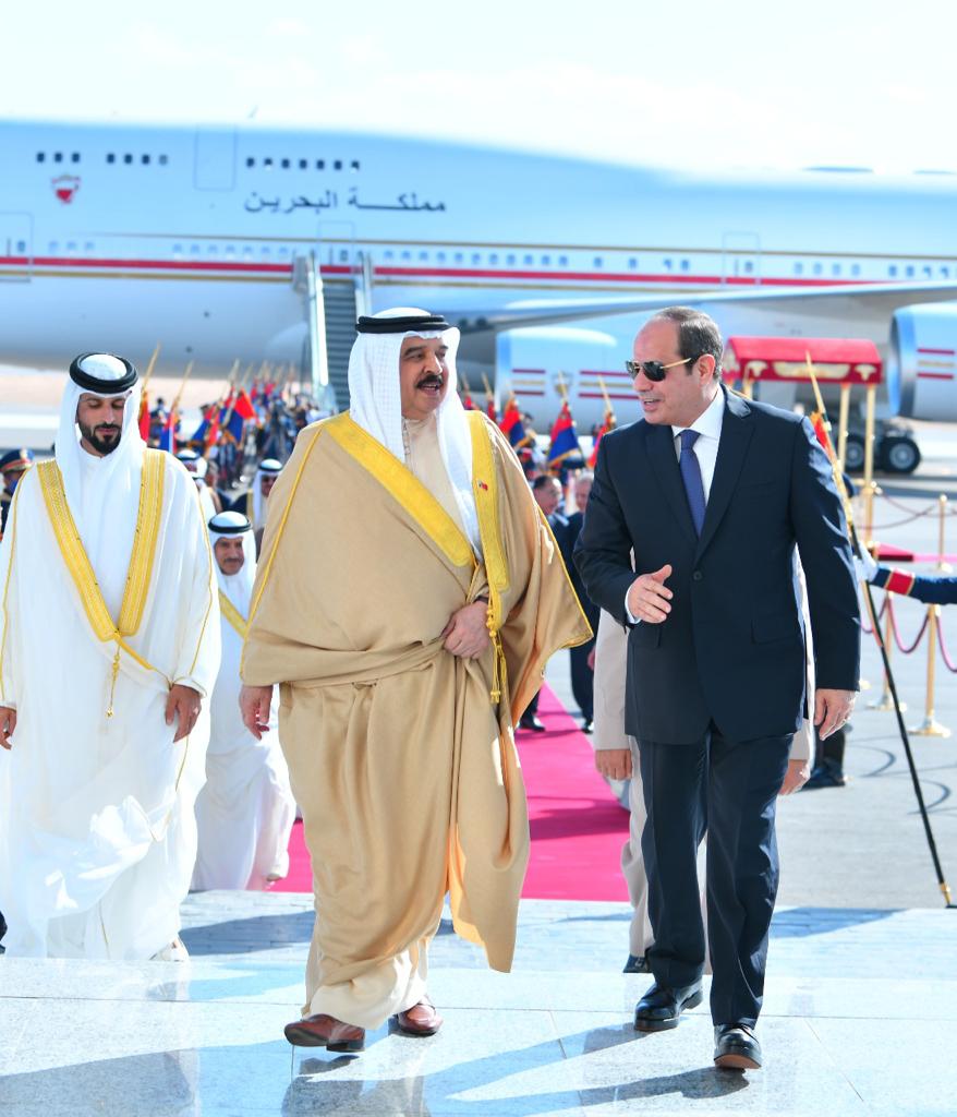 كما ودع الرئيس عبد الفتاح السيسي أخيه الملك حمد بن عيسي آل خليفة عاهل البحرين الشقيقة من مطار العلمين الدولي بعد زيارة استغرقت عدة أيام".