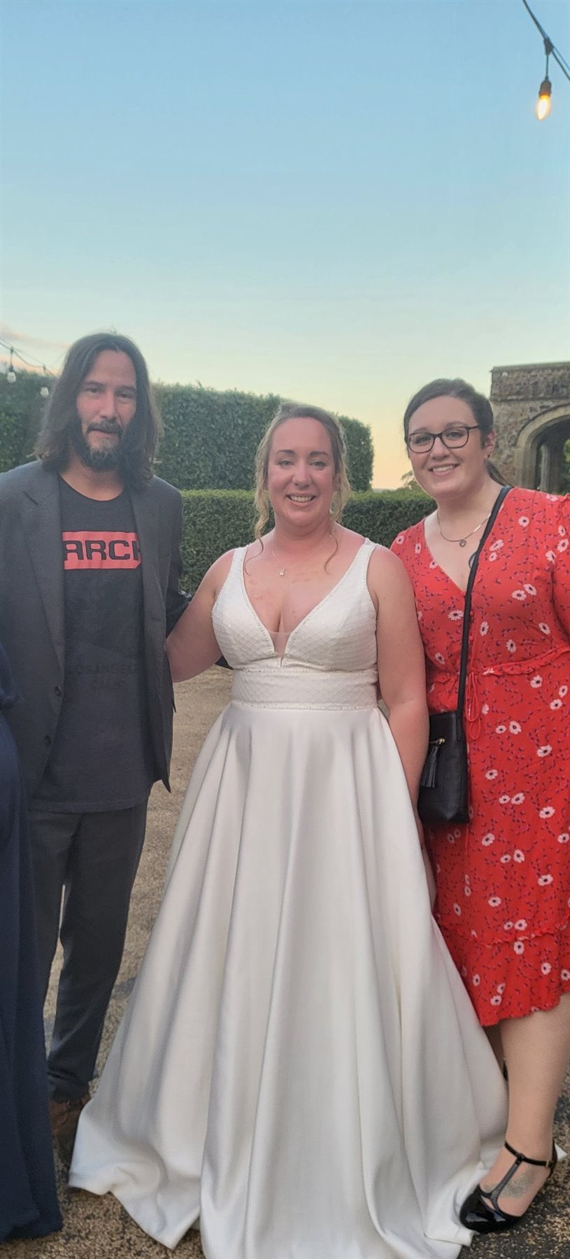 والتقط الممثل كيانو ريفز الصور التذكارية مع العروسين وعدد من الضيوف، وحرص على تمني حياة سعيدة للعروسين.