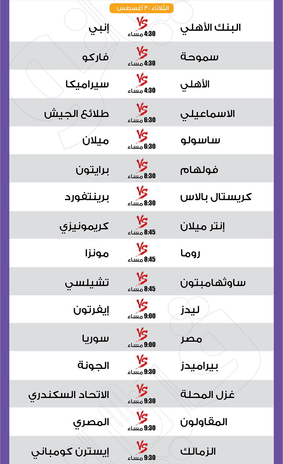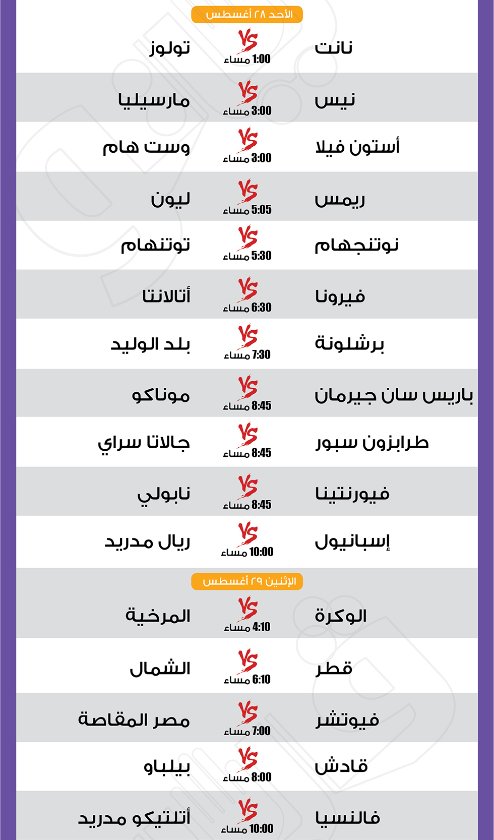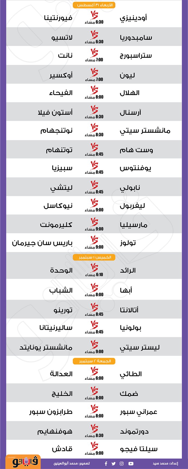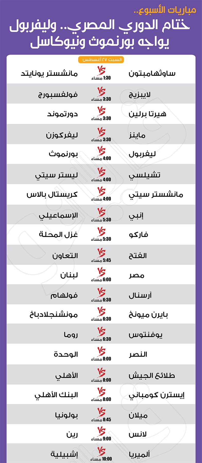 مباريات الأسبوع.. ختام الدوري المصري.. وليفربول يواجه بورنموث ونيوكاسل | إنفوجراف الجمعة 26/أغسطس/2022 - 07:30 م 8/26/2022 7:30:27 PM جدول مباريات الأسبوع محمد سيد شارك طباعة 18 حجم الخط شارك طباعة أرسنال الأهلي الاسماعيلي الهلال الزمالك باريس سان جيرمان بايرن ميونخ ريال مدريد طرابزون ليفربول