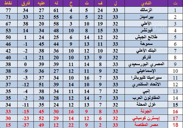 تنشر فيتو جدول ترتيب الدوري الممتاز لكرة القدم بعد انتهاء مباريات اليوم الجمعة في الجولة الـ 33 للمسابقة.