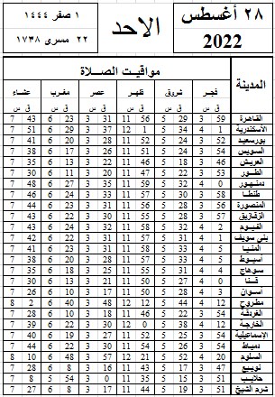 مواقيت الصلاة اليوم وفقًا للتوقيت المحلي لمدينتي القاهرة والإسكندرية وعدد من مدن ومحافظات الجمهورية من واقع بيانات الهيئة العامة للمساحة: