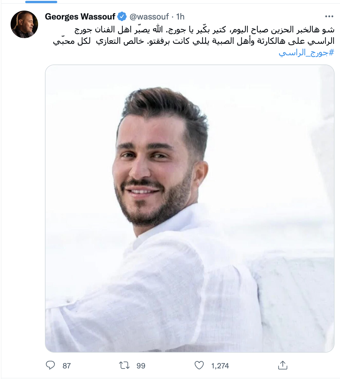 وكتب الفنان جورج وسوف عبر حسابه الرسمي على موقع "تويتر" قائلا: "شو هالخبر الحزين صباح اليوم، كتير بكّير يا جورج. الله يصبّر أهل الفنان جورج الراسي على هالكارثة وأهل الصبية يللي كانت برفقتو.. خالص التعازي لكل محبّي جورج الراسي”.