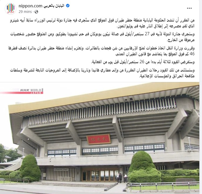 وأكد موقع "اليابان بالعربي"، مبادرة التعريف باليابان من قلب طوكيو، أنه من المقرر أن تنشئ الحكومة اليابانية منطقة حظر طيران فوق الموقع الذي ستُجرى فيه جنازة دولة لرئيس الوزراء سابقا شينزو آبي الذي لقي مصرعه إثر إطلاق النار عليه في يوليو الماضي.