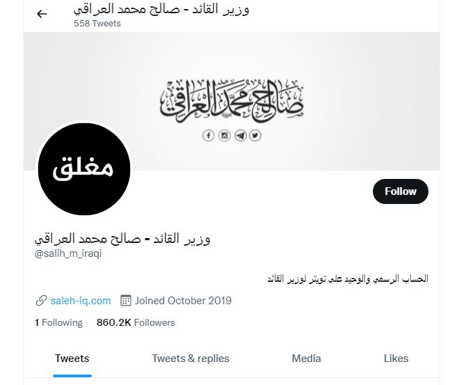 وضع صالح محمد العراقي، المعروف بـ"وزير القائد"، والمتحدث الدائم باسم مقتدى الصدر، زعيم التيار الصدري المستقيل، صورة مغلق على حسابه بموقع "تويتر".