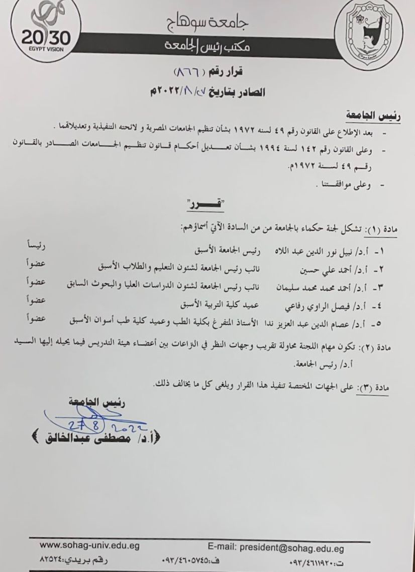 أصدر الدكتور مصطفى عبد الخالق رئيس جامعة سوهاج، قرارًا بتشكيل لجنة حكماء بالجامعة، تكون مهمتها محاولة تقريب وجهات النظر وحل المشكلات البسيطة بين منسوبي الجامعة، فيما يحيله إليها رئيس الجامعة.