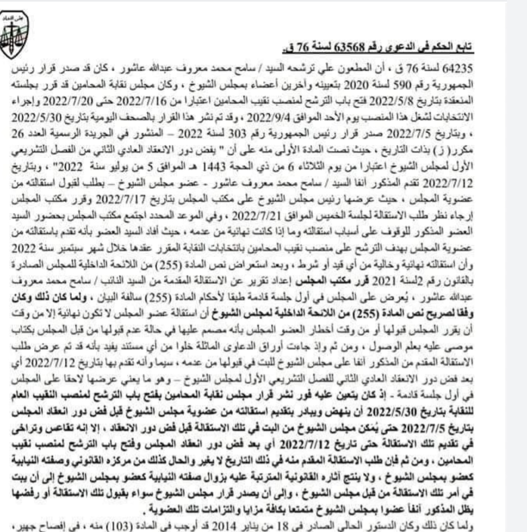 كما ذكرت المحكمة في حيثيات الحكم، أنه كان يتعين على المطعون عليه سامح عاشور فور نشر قرار مجلس نقابة المحامين بفتح باب الترشح لمنصب النقيب العام للنقابة بتاريخ ٣٠/٥/٢٠٢٢ أن ينهض ويبادر بتقديم استقالته من عضوية مجلس الشيوخ قبل فض دور انعقاد المجلس بتاريخ ٥/٧/٢٠٢٢ حتى يتمكن مجلس الشيوخ من البت في تلك الاستقالة قبل فض دور الانعقاد، إلا أنه تقاعس وتراخى في تقديم الاستقالة حتى تاريخ ١٢/٧/٢٠٢٢ أي بعد فض دور انعقاد المجلس وفتح باب الترشح لمنصب نقيب المحامين.