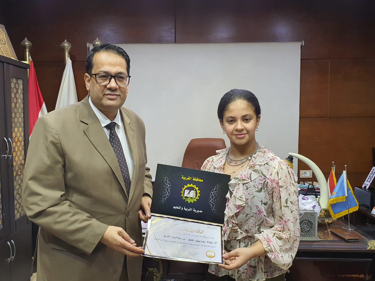 قام اليوم ناصر حسن، وكيل وزارة التربية والتعليم بالغربية، بتكريم الطالبة هنا إيهاب كشك، بالصف الثالث الاعدادي بمدرسة السلام للغات.