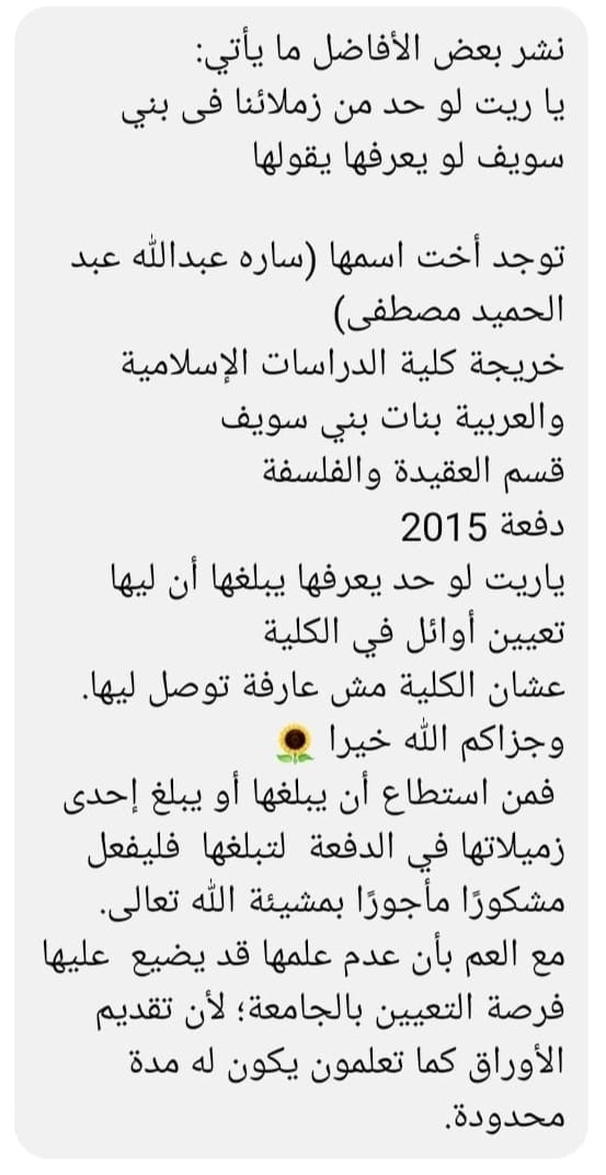 "توجد أخت اسمها "سارة عبدالله عبد الحميد مصطفى" خريجة كلية الدراسات الإسلامية والعربية بنات بني سويف، قسم العقيدة والفلسفة دفعة 2015.. ياريت لو حد يعرفها يبلغها أن ليها تعيين أوائل في الكلية.. عشان الكلية مش عارفة توصل ليها.