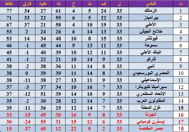تنشر فيتو جدول ترتيب الدوري الممتاز، بعد انتهاء الجولة الـ 33 للمسابقة وهبوط إيسترن كومباني رسميا بعد خسارته أمام البنك الأهلي 3-2.