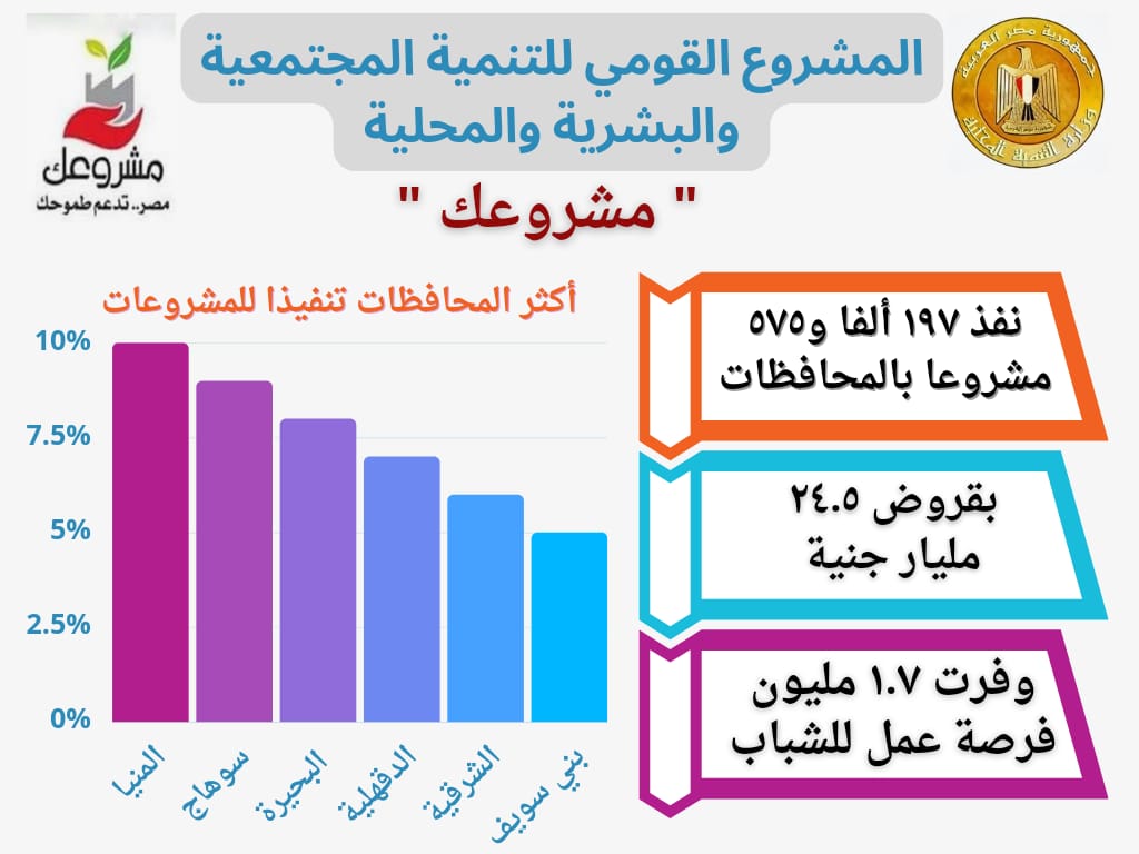 أكد اللواء هشام آمنة وزير التنمية المحلية سعى الوزارة الدائم لتشجيع ثقافة العمل الحر وريادة الأعمال لدى الشباب والمرأة بالتنسيق مع كافة الجهات المعنية وتشجيع تنفيذ المشروعات المتوسطة والصغيرة ومتناهية الصغر من خلال البرنامج القومي للتنمية المجتمعية والبشرية والمحلية ( مشروعك ) موضحًا أن البرنامج نفذ 197 ألفًا و575 مشروعًا في المحافظات بقروض اقتربت من 24.5 مليار جنيه، ووفرت هذه المشروعات 1.7 مليون فرصة عمل.