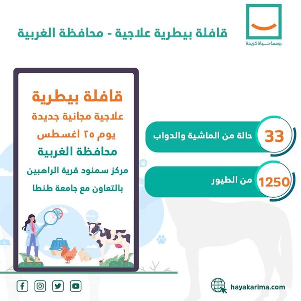 - القافلة البيطرية نجحت في علاج ٣٣ رأس ماشية و١٢٥٠ من الطيور، وتم رش جميع الحيوانات ضد الطفيليات الخارجية.