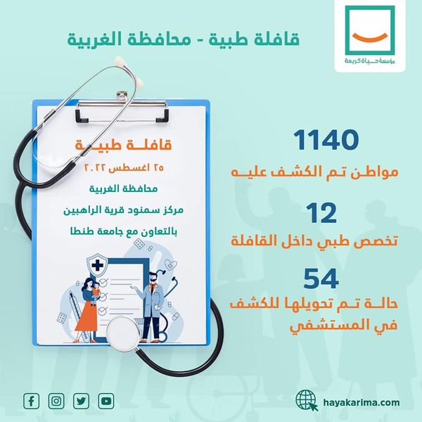 - في محافظة الغربية مركز سمنود قرية الراهبين، جامعة طنطا بالتعاون مع مؤسسة حياة كريمة نظموا قافلتين طبية وبيطرية.