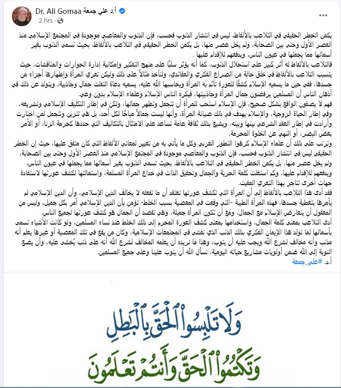 وكتب الدكتور علي جمعة تدوينة على الفيس بوك "يكمن الخطر الحقيقي في التلاعب بالألفاظ، ليس في انتشار الذنوب فحسب، فإن الذنوب والمعاصي موجودة في المجتمع الإسلامي منذ العصر الأول وحتى بين الصحابة، ولم يخل عصر منها، بل يكمن الخطر الحقيقي في التلاعب بالألفاظ، بحيث تسمى الذنوب بغير أسمائها مما يجملها في عيون الناس، ويدفعهم للإقدام عليها."
