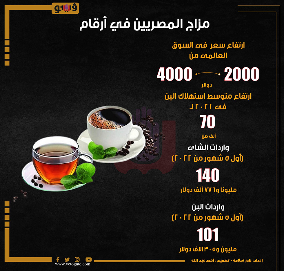 مزاج المصريين في أرقام | إنفوجراف الإثنين 29/أغسطس/2022 - 04:10 م 8/29/2022 4:10:30 PM الشاى والقهوة نادر سلامة شارك طباعة 18 حجم الخط شارك طباعة الكافيين فاتورة واردات مصر العام الجاري واردات مصر