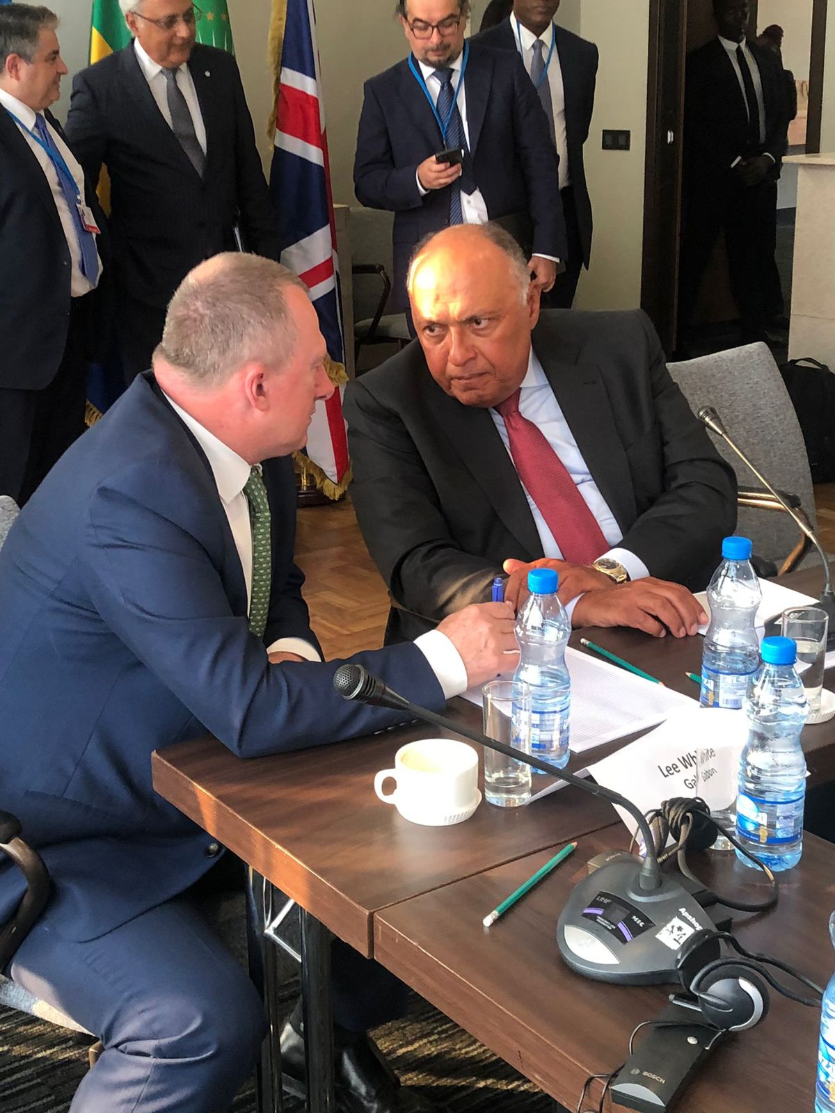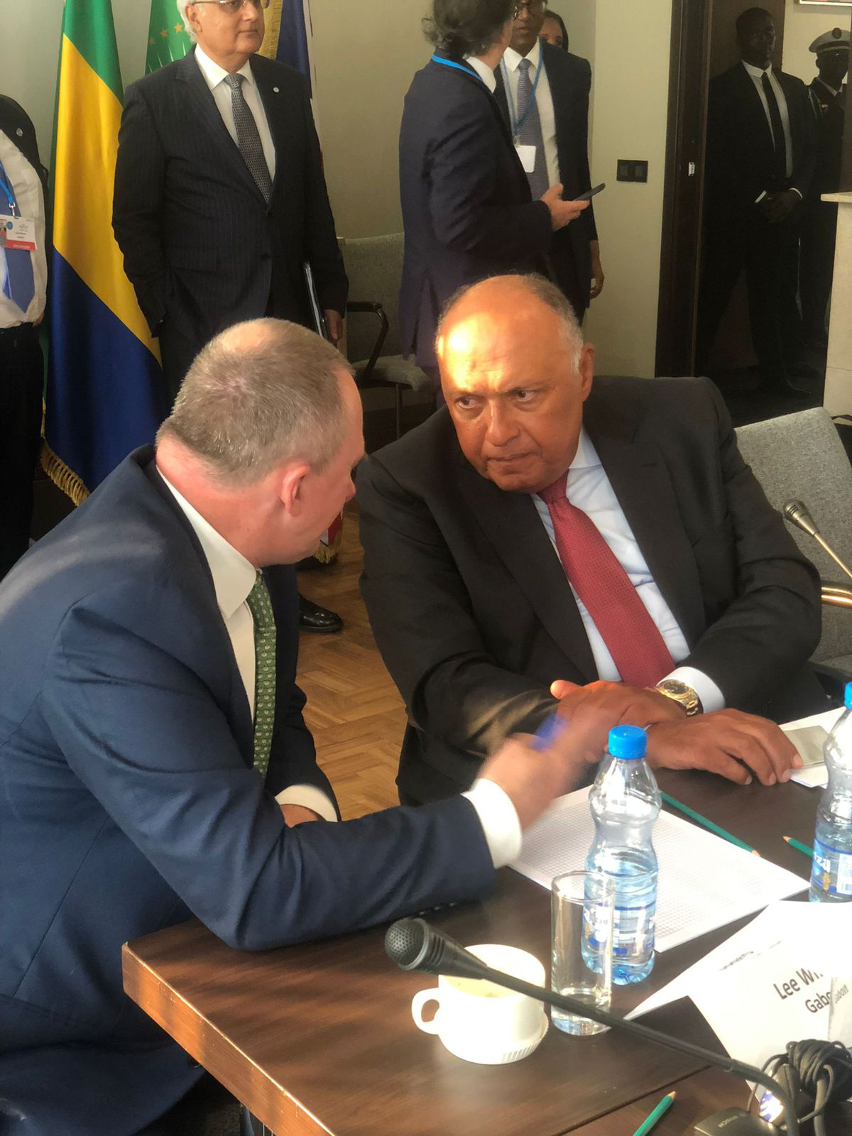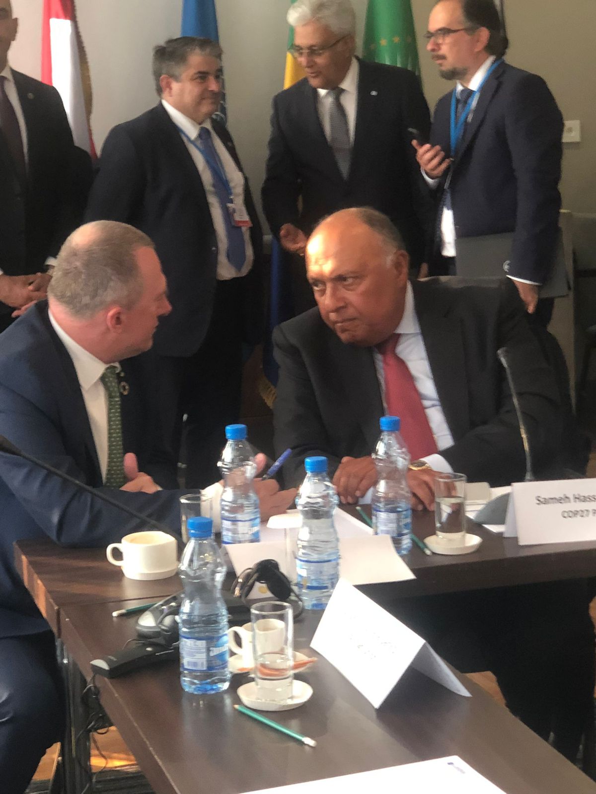 التقى وزير الخارجية سامح شكري، الرئيس المعين للدورة ٢٧ لمؤتمر أطراف اتفاقية الأمم المتحدة الإطارية لتغير المناخ COP27، اليوم الإثنين ٢٩ أغسطس ٢٠٢٢، وزير البيئة وتغير المناخ والغابات والمحيطات الجابوني "لي وايت" على هامش المشاركة في فعاليات أسبوع المناخ لإفريقيا المنعقد بدولة الجابون.