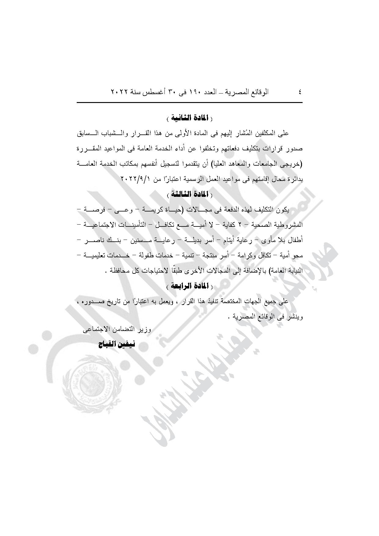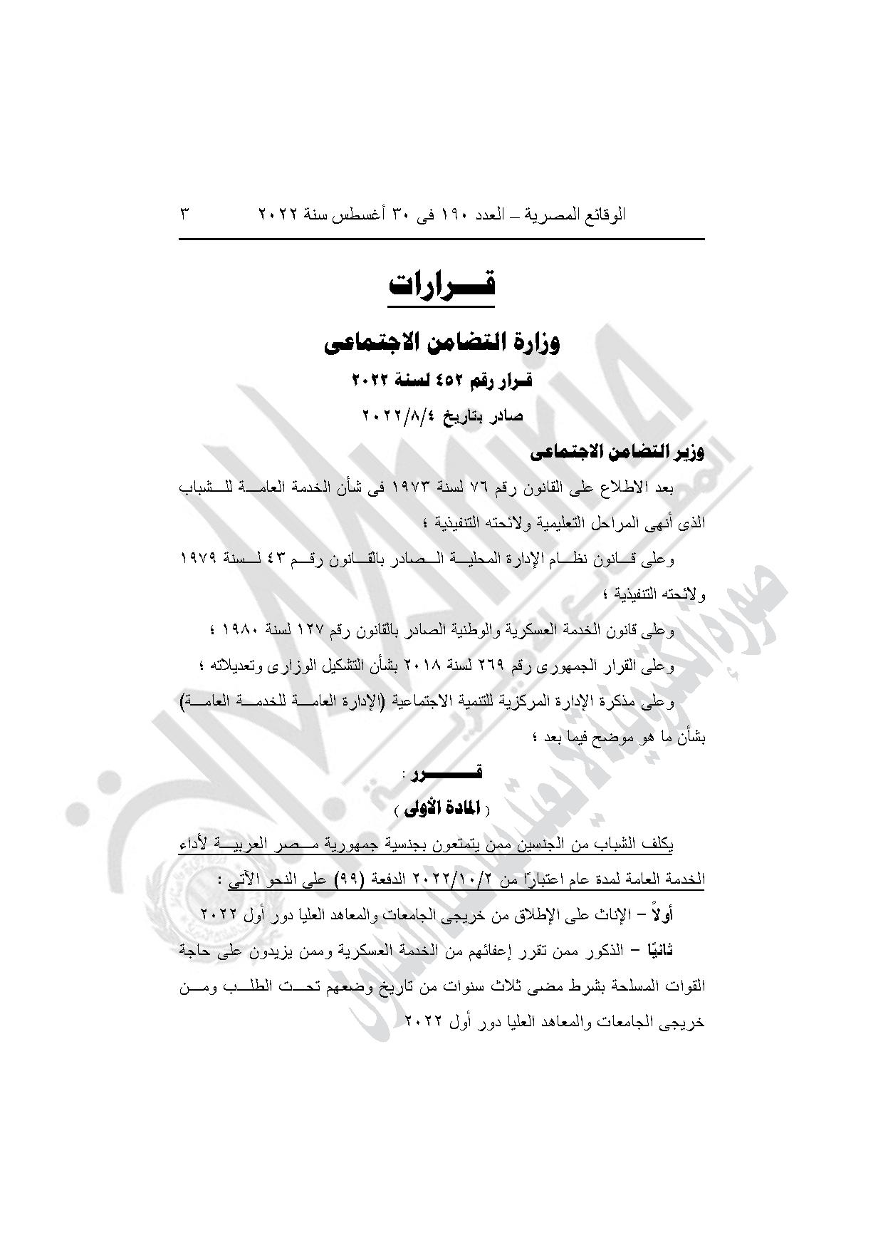 نشرت جريدة الوقائع المصرية في عددها رقم 190، الصادر في 30 أغسطس 2022، قرار وزارة التضامن الاجتماعي رقم 452 لسنة 2022، بشأن تكليف الشباب من الجنسين لأداء الخدمة العامة لمدة عام.