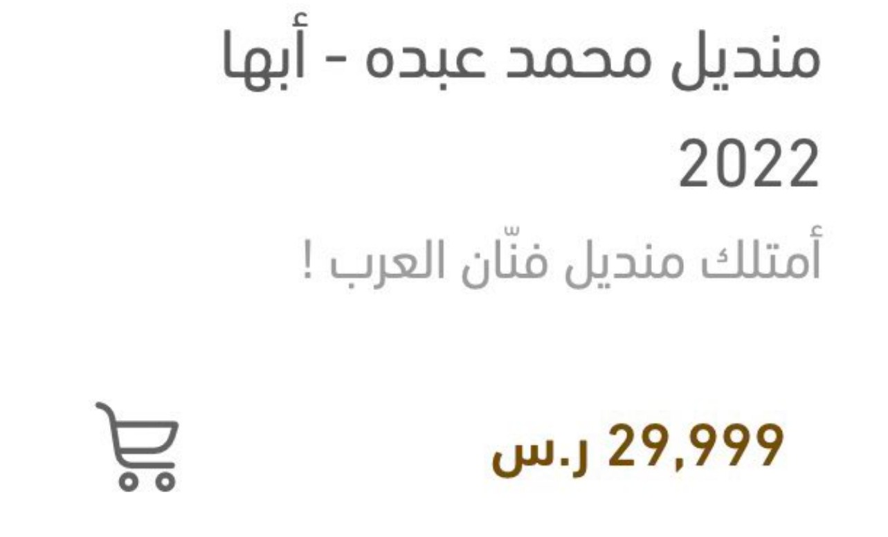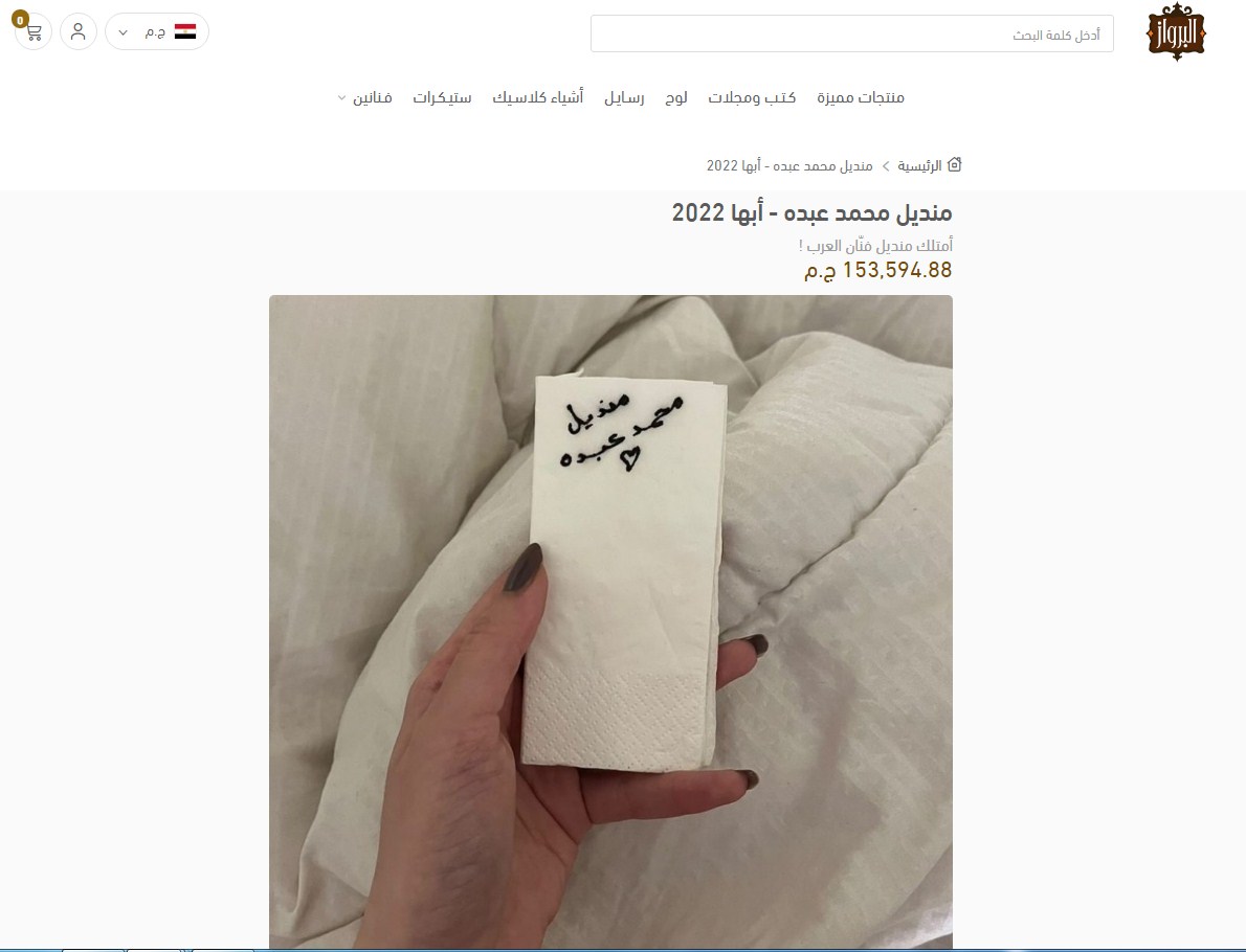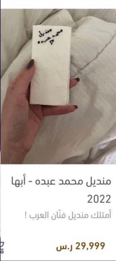 وقام المتجر بعرض المنديل بصورة التقطت في يد إحدى الفتيات اللاتي حضرن الحفل، وكتبت الفتاة عليه "منديل محمد عبده" مع رسمة قلب، وكتب المتجر في الإعلان "منديل محمد عبده المستخدم في حفلة أبها 2022.. أمتلك منديل فنان العرب" وعُرض بمبلغ 29.999 ريال سعودي.