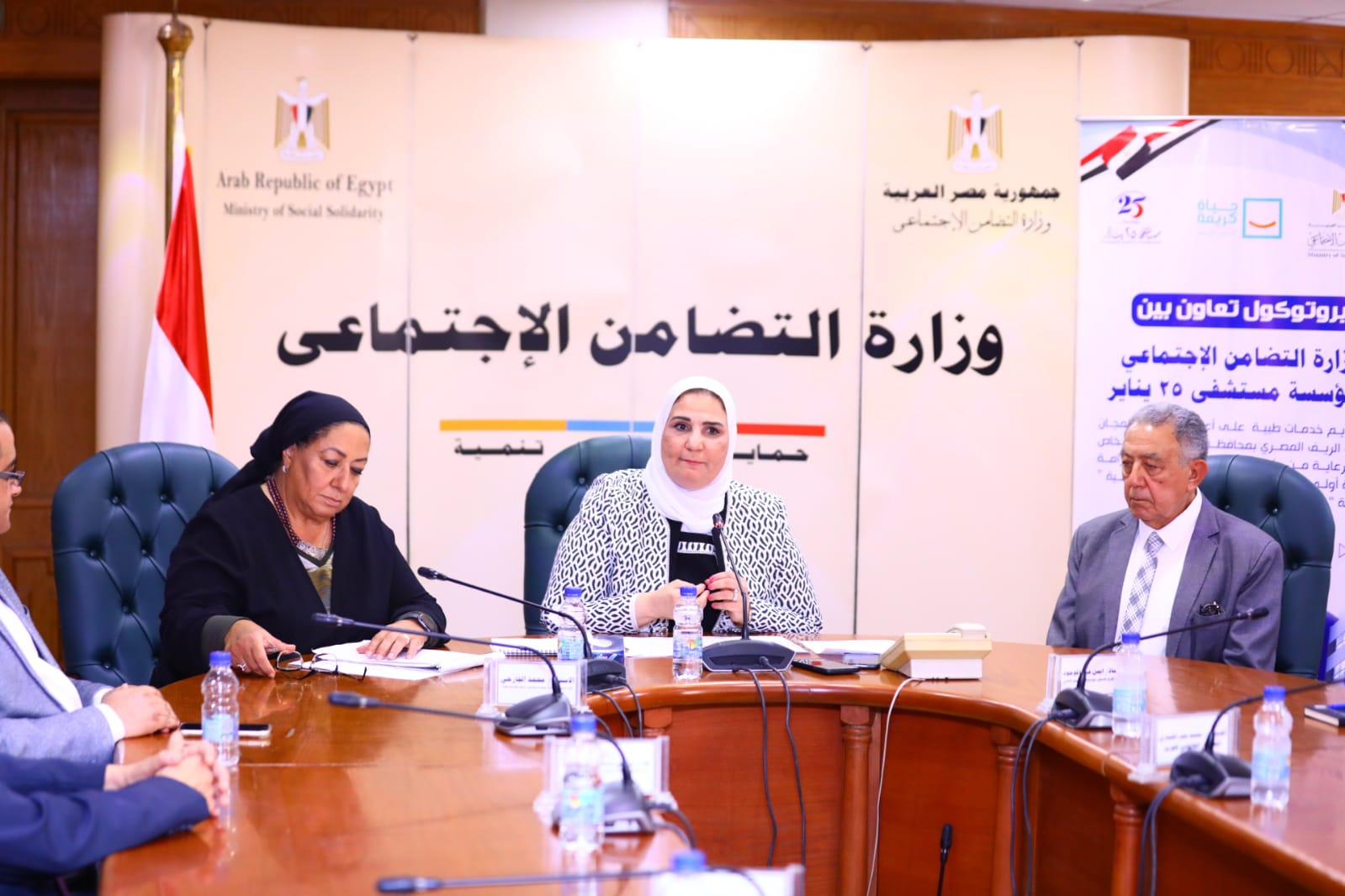 وقعت نيفين القباج وزيرة التضامن الاجتماعي والدكتورة مها الرباط رئيس مجلس أمناء مؤسسة مستشفى 25 يناير للخدمات الطبية بروتوكول تعاون بين الوزارة والمؤسسة بشأن تقديم خدمات طبية على أعلى مستوى بالمجان في قلب الريف المصري بمحافظة الشرقية للأشخاص الأولى بالرعاية من حاملي بطاقة «تكافل وكرامة» كمشاركة أولى من المؤسسة في المبادرة الرئاسية « حياة كريمة» في المجال الصحي من إنسان إلى إنسان للعلاج بالمجان.