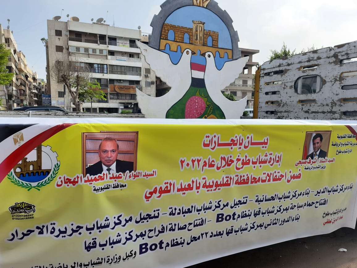 عرضت مديرية الشباب والرياضة بالقليوبية بانرات تستعرض أشهر المحاصيل الزراعية التي تشتهر بها محافظة القليوبية منها إدارة طوخ التي تشتهر بمحاصيل المشمش والفراولة كما عرضت إنجازات الإدارة في حمامات السباحة ومراكز الشباب وغيرها.