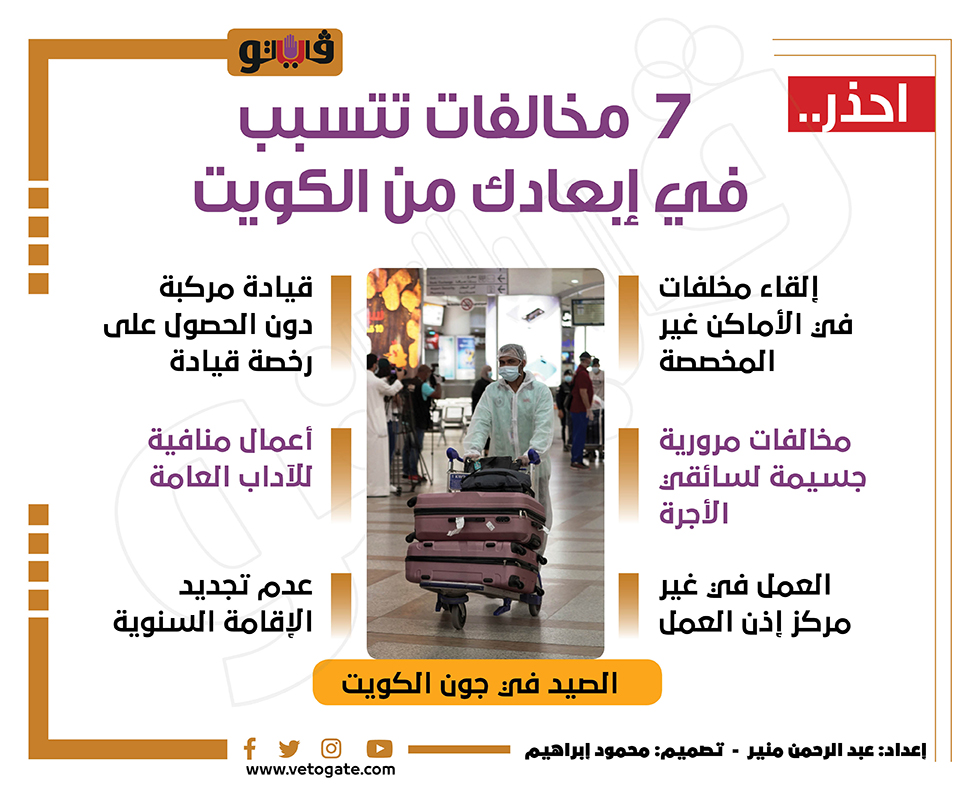 احذر.. 7 مخالفات تتسبب في إبعادك من الكويت | إنفوجراف الثلاثاء 30/أغسطس/2022 - 10:13 م 8/30/2022 10:13:23 PM الوافدون في الكويت عبدالرحمن منير شارك طباعة 18 حجم الخط شارك طباعة الكويت الوافدين بالكويت قوانين العمل