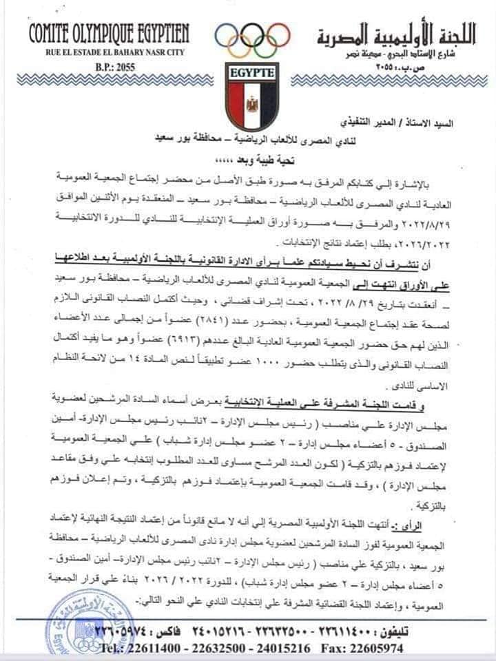 الأوليمبية تعتمد نتيجة انتخابات النادي المصري البورسعيدي