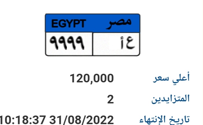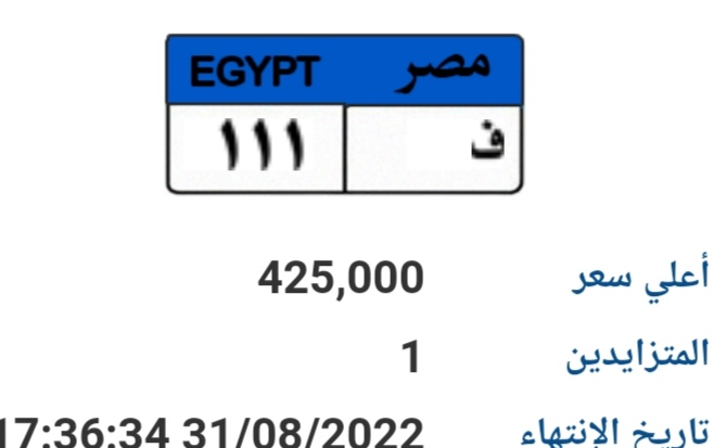 كما شملت اللوحات المتاحة للمزايدة "ع ج ي 1111" بقيمة 75 ألف جنيه، "ج ب ر 666" بقيمة 125 ألف جنيه، "أ س س 2222" بقيمة 105 آلاف جنيه، "م ط ر 5555" بقيمة 100 ألف جنيه، "ف 111" بقيمة 425 ألف جنيه، "أ ع 9999" بقيمة 120 ألف جنيه.