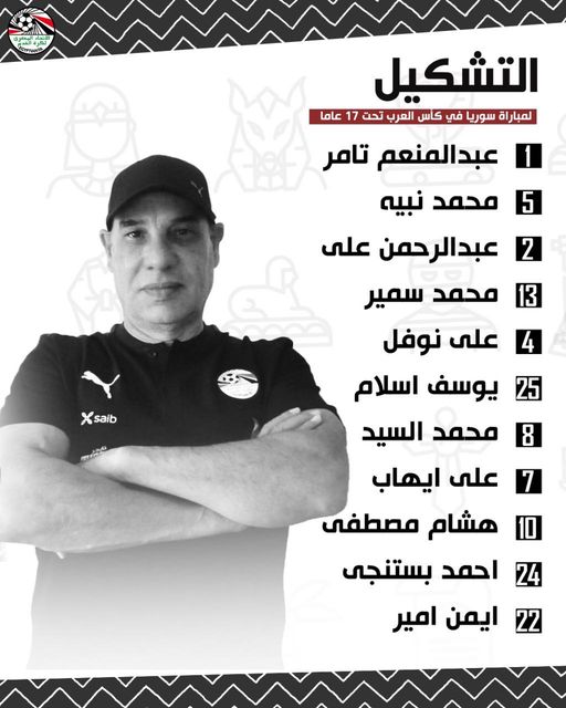 أعلن الجهاز الفني لمنتخب مصر للناشئين مواليد 2006 تشكيل الفريق لمواجهة نظيره السوري في دور المجموعات لكأس العرب تحت 17 عاما المقامة حاليا بالجزائر على النحو التالي: