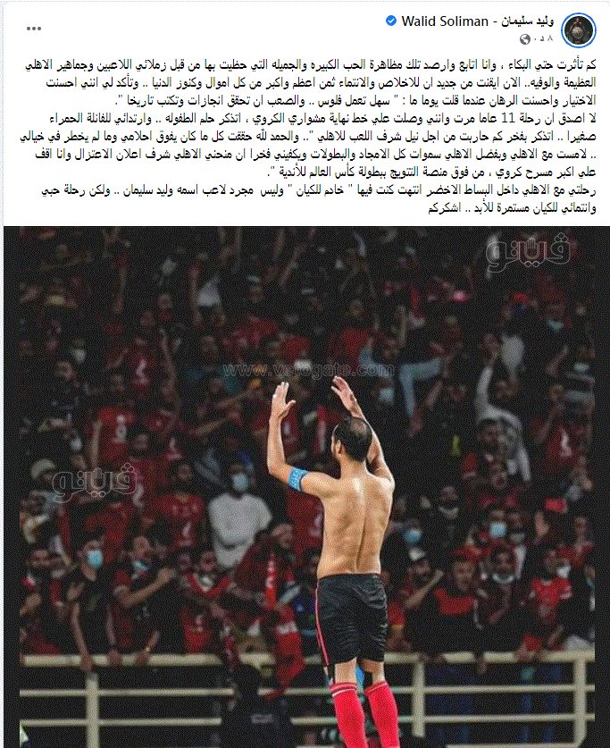 رحلتي مع الاهلي داخل البساط الاخضر انتهت كنت فيها " خادم للكيان " وليس مجرد لاعب اسمه وليد سليمان.. ولكن رحلة حبي وانتمائي للكيان مستمرة للأبد.. اشكركم