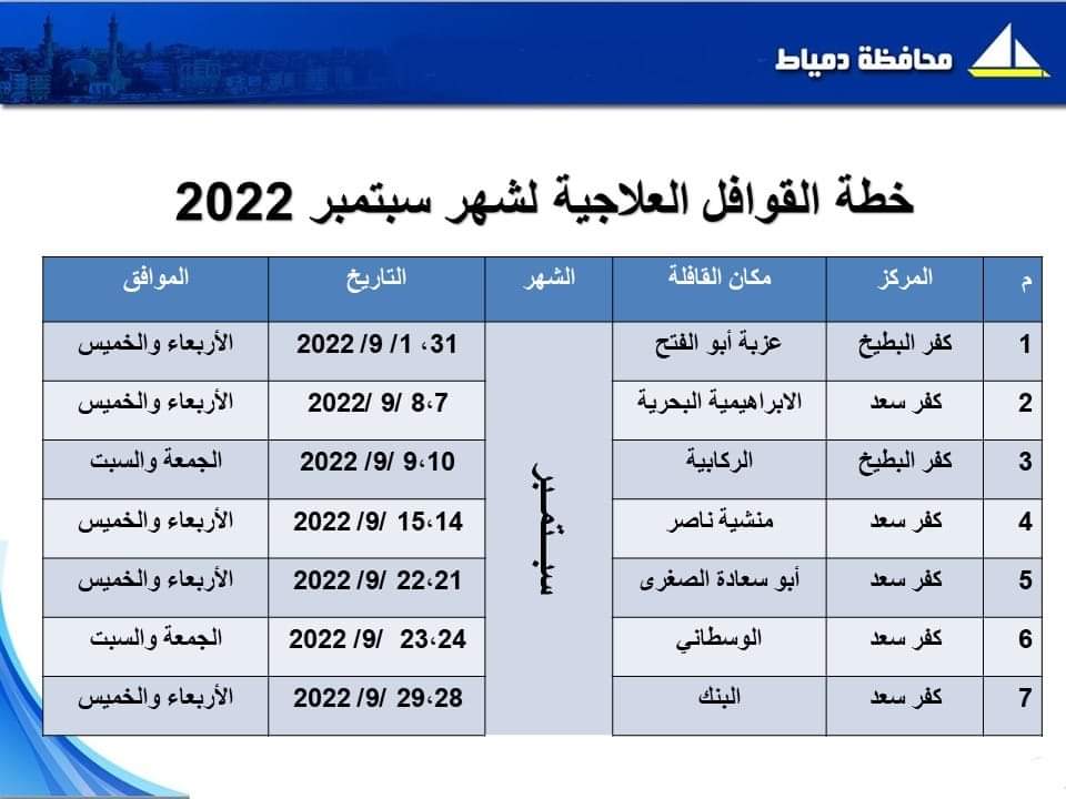 ومن المقرر أن يبدأ تنفيذ الخطة بتنفيذ قافلة طبية بعزبة أبو الفتح بمركز كفر البطيخ بدءًا من اليوم وحتى غدًا الخميس، وانطلاق قافلة بالإبراهيمية البحرية بمركز كفر سعد يومي الأربعاء والخميس (7، 8 سبتمبر) وأخرى بقرية الركابية بمركز كفر البطيخ يومي الجمعة والسبت الموافقين (9، 10 سبتمبر)، وأخرى بكفر سعد بمنشية ناصر يومي الأربعاء والخميس الموافقين (14، 15 سبتمبر).
