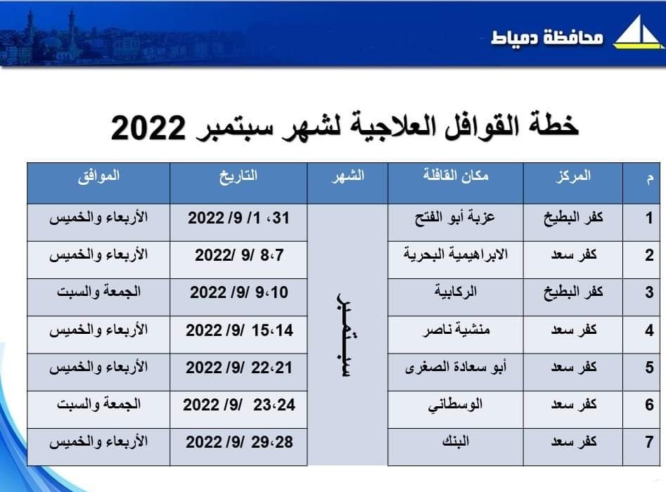 صحة دمياط تُعلن عن بدء تنفيذ خطة القوافل العلاجية المجانية لشهر سبتمبر