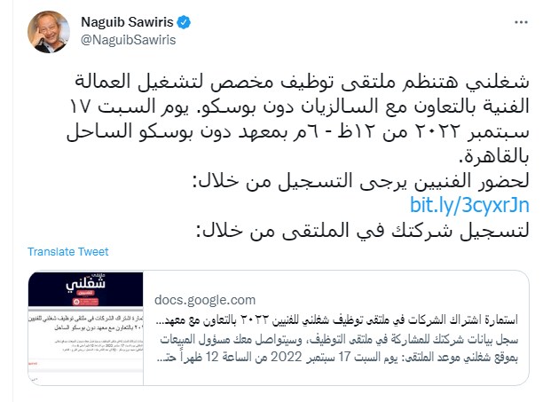 وكتب نجيب ساويرس في تغريدة سابقة على تويتر قال فيها: "شغلني هتنظم ملتقى توظيف مخصص للسيدات لدعم تمكين المرأة، هيتوفر فيه فرص عمل مميزة أكتر من أكبر الشركات في مصر. الملتقى يوم السبت ٢١ مايو ٢٠٢٢ من ٩صباحا - ٦مساء بمبنى الجريك كامپس بالتحرير".