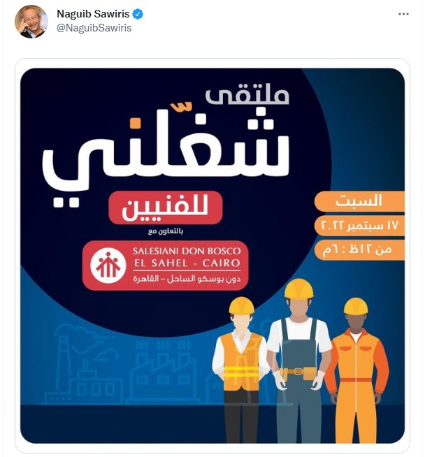 وكتب نجيب ساويرس تغريدة على توتير " شغلني هتنظم ملتقى توظيف مخصص لتشغيل العمالة الفنية بالتعاون مع السالزيان دون بوسكو. يوم السبت ١٧ سبتمبر ٢٠٢٢ من ١٢ظ - ٦م بمعهد دون بوسكو الساحل بالقاهرة."