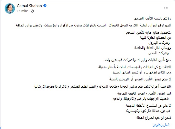 وكتب الدكتور جمال شعبان تدوينة على الفيس بوك "رؤيتي بالنسبة للـ تأمين الصحي.. المهم توفير الموارد المالية اللازمة لتمويل الخدمات الصحية باشتراكات معقولة من الأفراد والمؤسسات وتعظيم موارد إضافية كتحصيل مبالغ مالية للتأمين الصحي.. من المصانع الملوثة للبيئة وشركات البترول، ووسائل النقل العامة والخاصة، وشركات الدخان".