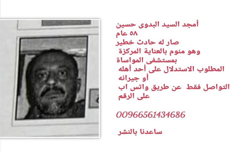 يشار إلى أن المصري أمجد السيد البدوي حسين، لم يستدل على أسرته عن دخوله مستشفى المواساة ولم يكن لديه أي أوراق ثبوتية؛ وناشد حينها أبناء الجالية من يتعرف على صورته الاتصال بالأرقام المتاحة وبالفعل تم التوصل إلى أسرته فى مصر من خلال صورته الشخصية، وتواصلوا مع المواطن المصري هانى عصام حماد الذي قام بدوره بتسهيل جيع الإجراءات مع البعثة الدبلوماسية وحصل على موافقة عائلته بدفنه فى مقابر الحائر