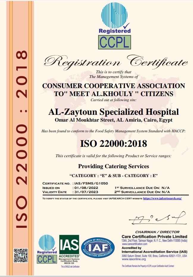 وحصل قسم التغذية بمستشفي الزيتون التابع للإدارة الفندقية علي إعتماد شهادة الأيزو 22000/2018 نظم إدارة جودة وسلامة الغذاء بالمنشآت الغذائية كأحد الأنظمة العالمية المتبعة في السلامة الغذائية ويعد ذلك الإنجاز هو الثاني علي مستوى مستشفيات الأمانة ويأتي ذلك تماشيا مع السياسات العامة لأمانة المراكز الطبية المتخصصة والتي تهدف إلى تطبيق أعلى نظم ومعايير الجودة العالمية في مجال الخدمة الطبية والخدمات المساعدة لراحة المرضي والمترددين والعاملين وجميع الفئات بالمنشآت الطبية التابعة لأمانة المراكز الطبية المتخصصة.