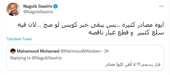 وكتب نجيب ساويرس تغريدة على تويتر عن قرار إلغاء الاعتماد المستندي للاستيراد: "أيوه مصادر كتيرة.. بس يبقى خبر كويس لو صح… لأن فيه سلع كتيير وقطع غيار ناقصة"، وذلك ردًا على سؤال أحد المتابعين عما إذا كان قرار "إلغاء قرار الاعتماد المستندي للاستيراد والعودة بالتحصيل المستندي" رسمي أم لا.