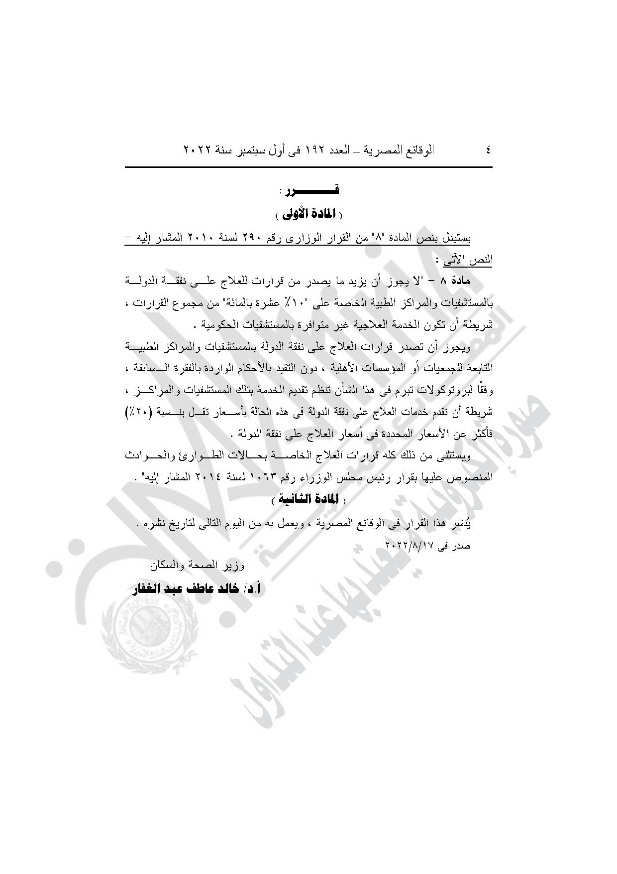 نشرت جريدة الوقائع المصرية في عددها رقم 192، الصادر في أول سبتمبر 2022، قرار وزير الصحة والسكان الدكتور خالد عبد الغفار، رقم 310 لسنة 2022، بشأن تعديل بعض أحكام قرار وزير الصحة والسكان رقم 290 لسنة 2010 بإعادة تنظيم قواعد وإجراءات العلاج على نفقة الدولة.