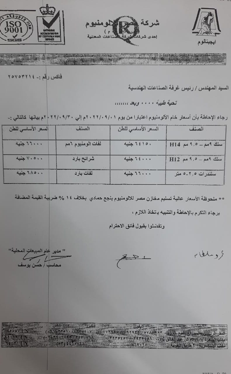 أعلنت شركة مصر للألومنيوم أسعار خامات الألومنيوم اعتبارا من بداية الشهر الحالى “سبتمبر ” وحتى نهاية الشهر.
