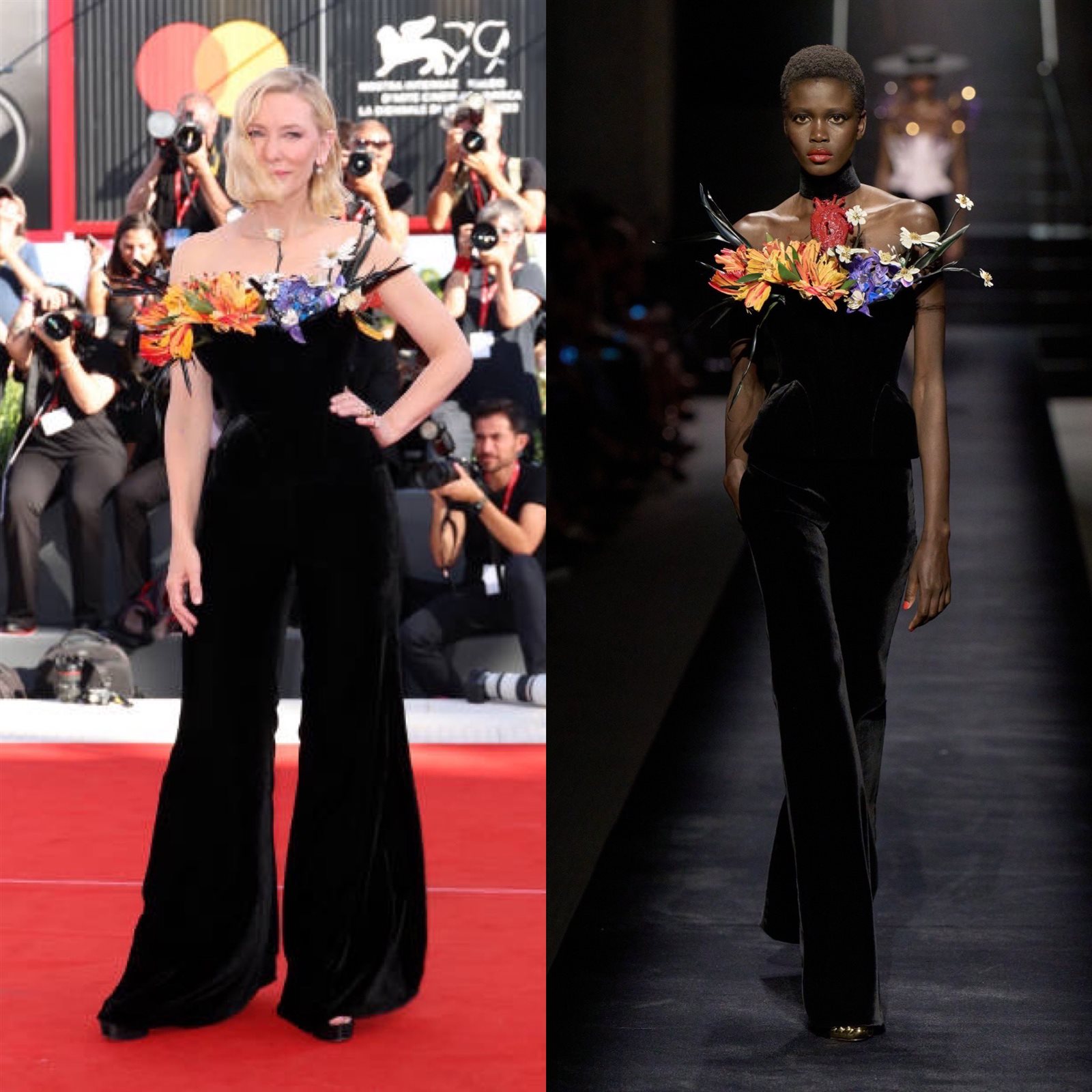 ولفتت كيت بلانشيت الأنظار إليها بأناقتها خلال المؤتمر والسجادة الحمراء الخاصين بفيلمها TAR، وارتدت خلال المؤتمر الصحفي بدلة سماوي أنيقة، فيما اختارت بدلة سوداء مزين بالورد من مجموعة Schiaparelli FW22.