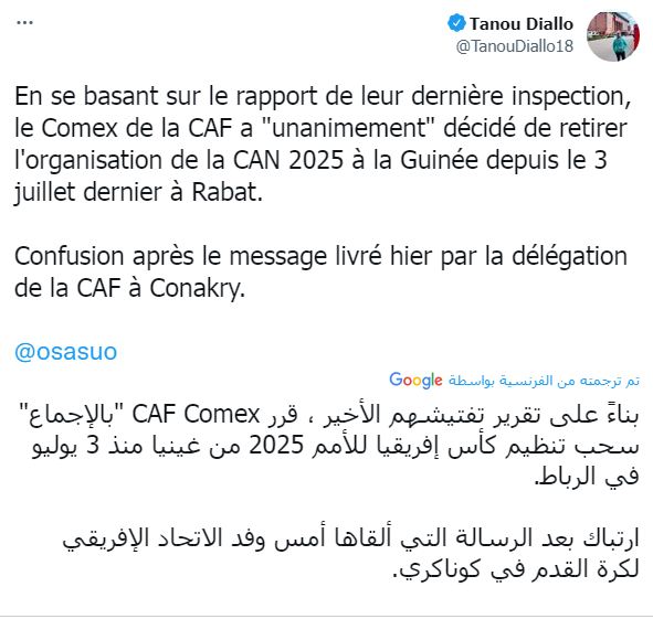ونشر المسؤول في اللجنة الإعلامية لـ الاتحاد الأفريقي لكرة القدم “كاف”، تانو ديالو جانبا من المراسلة التي تلقاها اتحاد غينيا لكرة القدم.