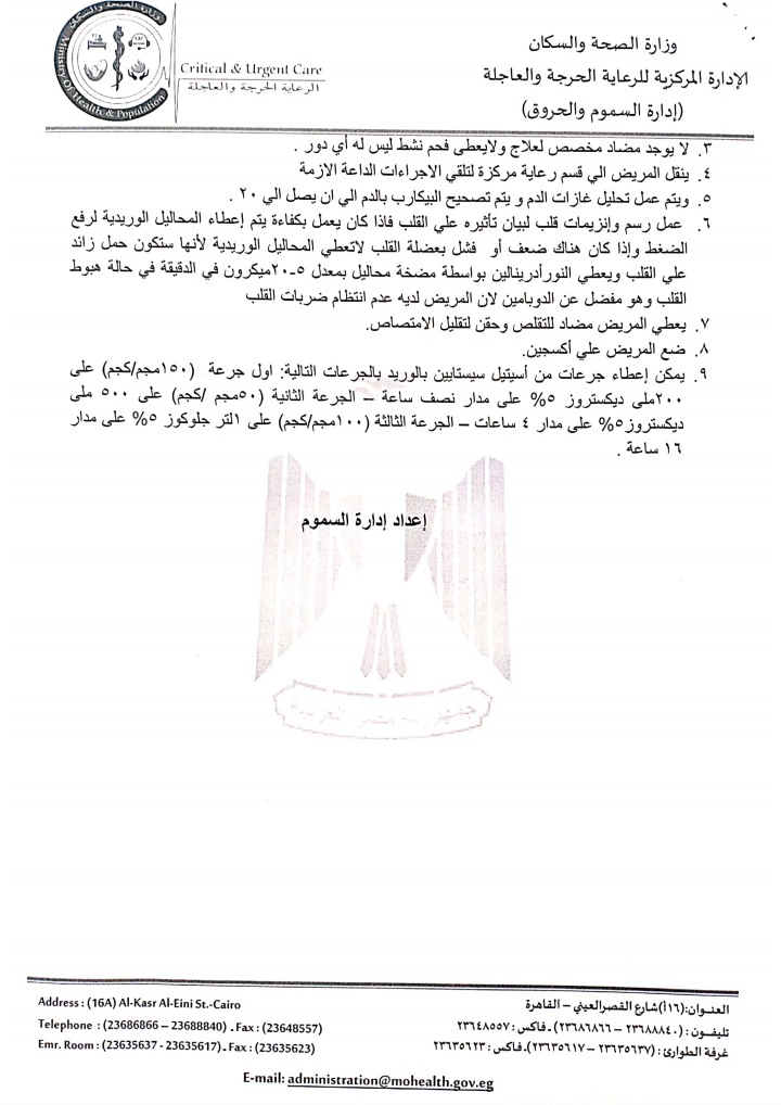 ٤. ينقل المريض الى قسم رعاية مركزة لتلقي الإجراءات اللازمة