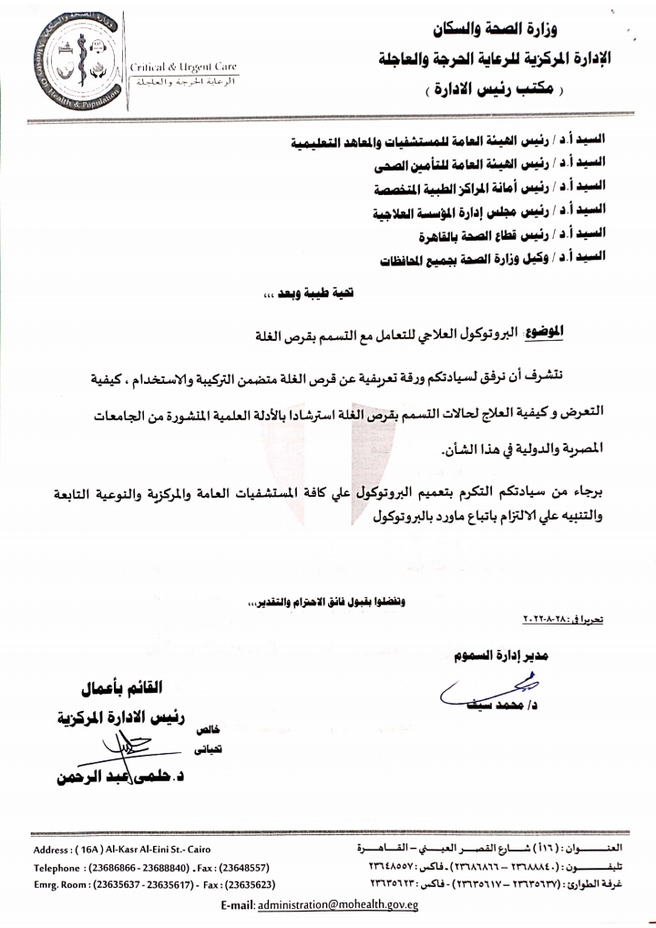 تضمن البروتوكول التركيبة والاستخدام، كيفية التعرض وكيفية العلاج لحالات التسمم بقرص الغلة استرشادا بالأدلة العلمية المنشورة من الجامعات المصرية والدولية في هذا الشأن.