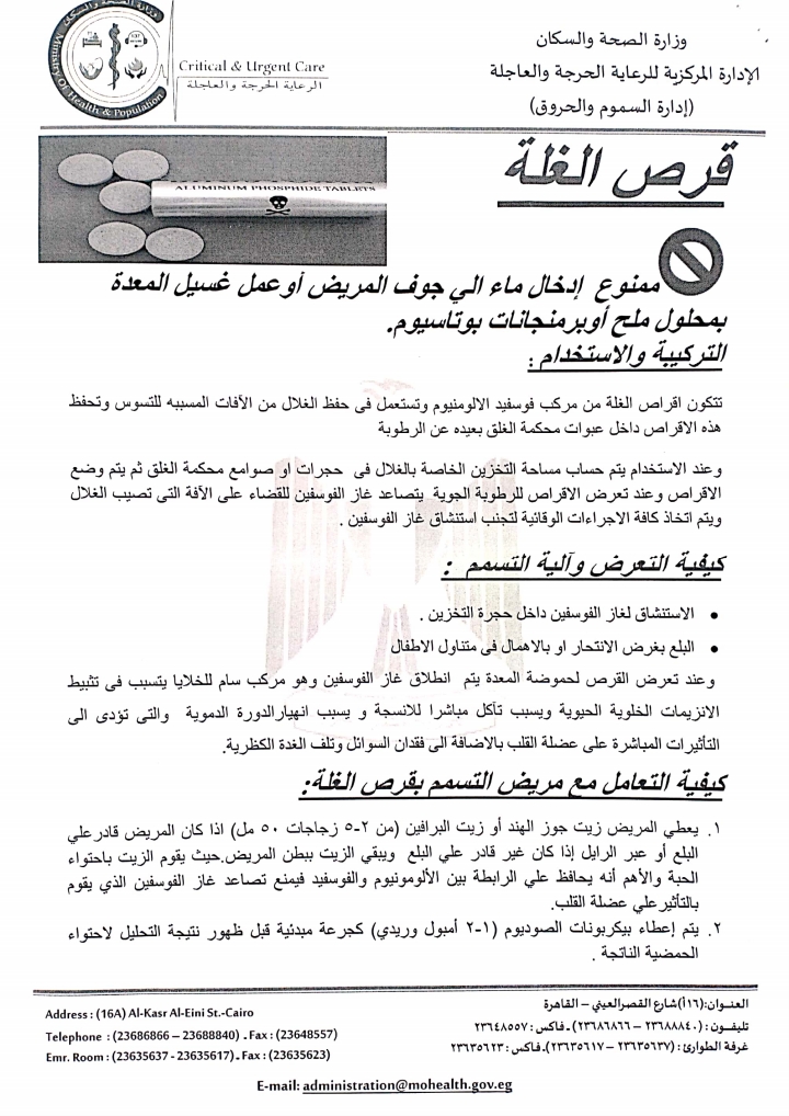 تنشر فيتو البروتوكول العلاجي للتعامل مع حالات التسمم بقرص الغلة والذي وضعته إدارة السموم بالإدارة المركزية للرعاية الحرجة والعاجلة بوزارة الصحة.