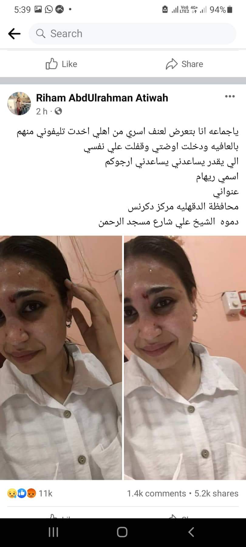 وتابعت ريهام فى بوست قائلة "ياجماعه انا بتعرض لعنف اسري من اهلي اخدت تليفوني منهم بالعافيه ودخلت اوضتي وقفلت علي نفسي اللي يقدر يساعدني يساعدني ارجوكم..اسمي ريهام وعنواني محافظة الدقهليه مركز دكرنس دموه الشيخ علي شارع مسجد الرحمن"