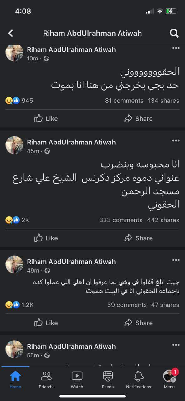 وكانت ريهام دونت علي حسابها الشخصي "حد يجيلى البيت يلحقنى أنا بموت" هكذا نشرت ريهام عبدالرحمن إبنة مدينة دكرنس الفتاة العشرينية.